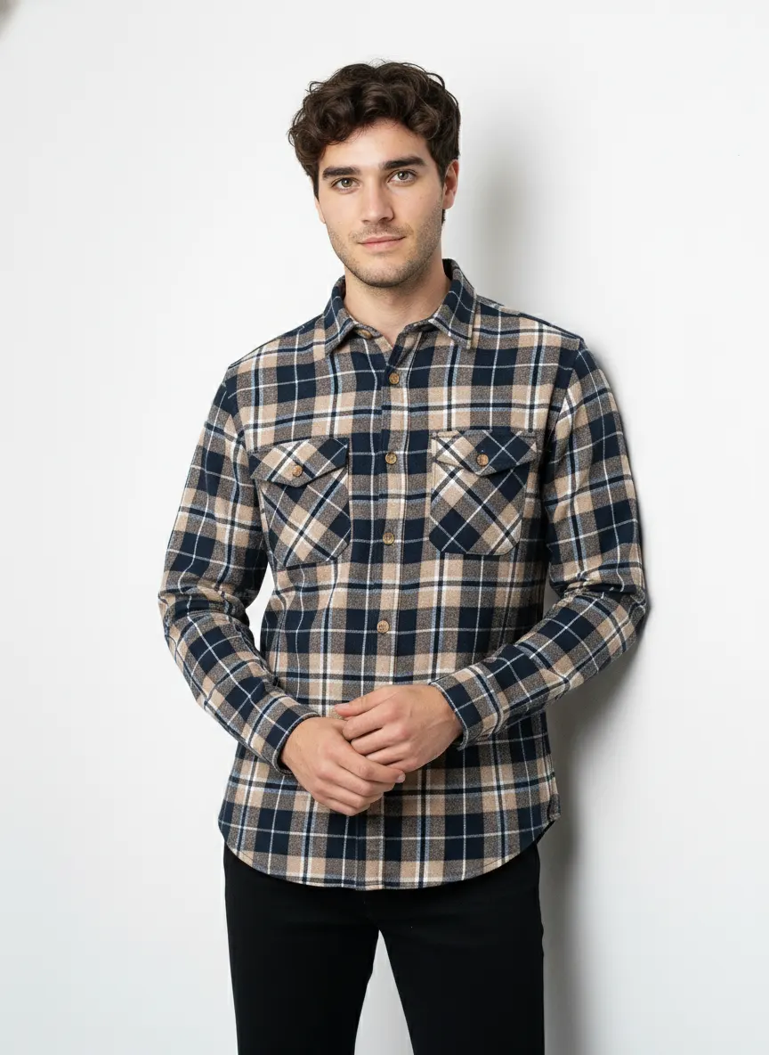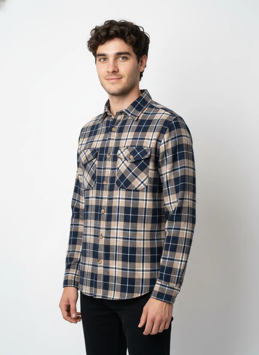 brushed check utility dual pocket shirt – navy & beigeBrushed Check Utility Dual Pocket Shirt – Navy