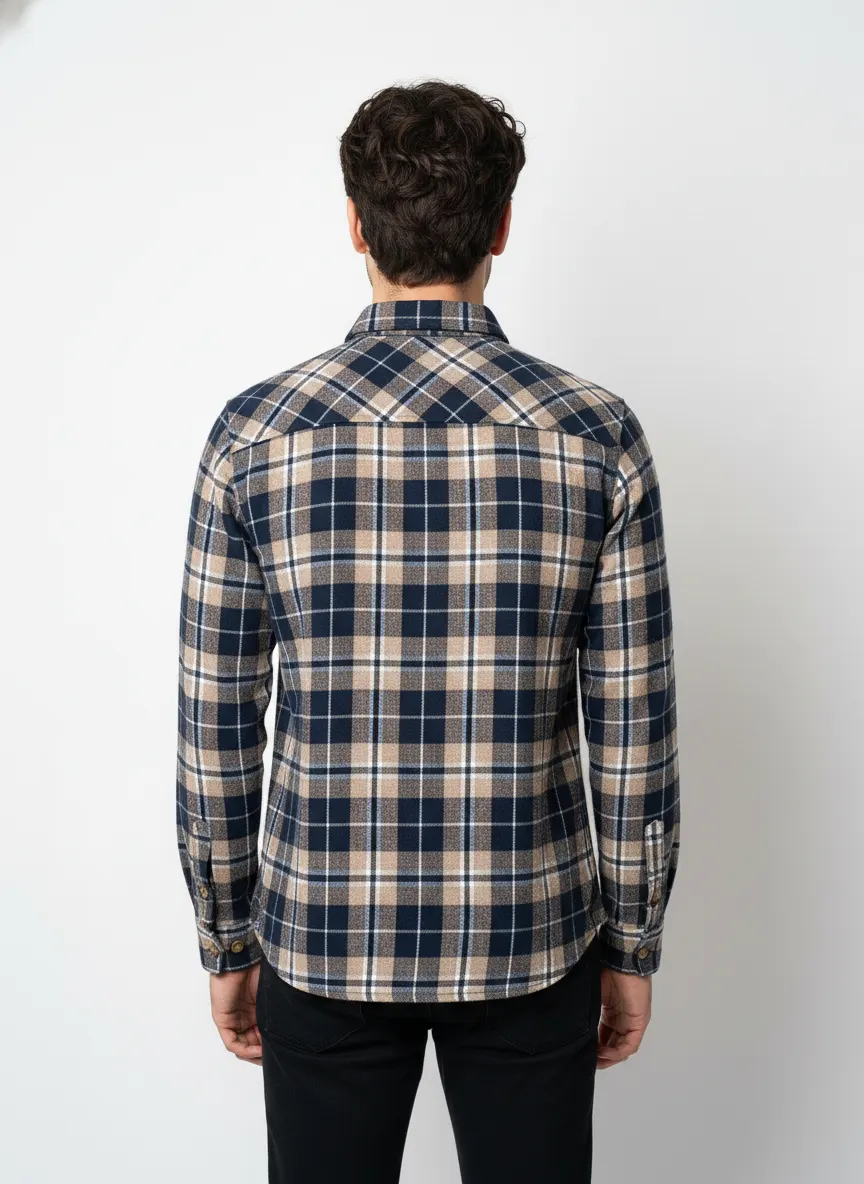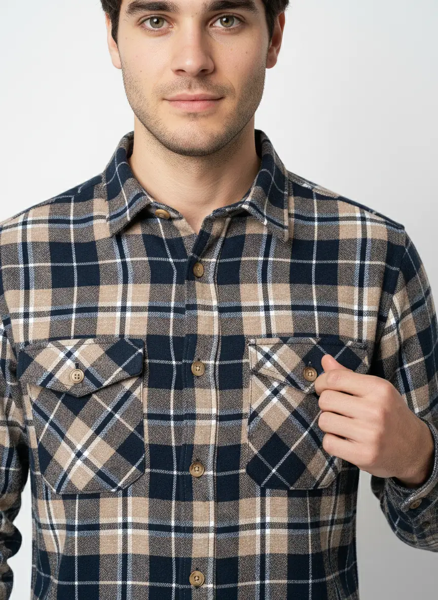 The timeless navy and beige check pattern gives this shirt a strong yet balanced look — perfect for casual outings, travel days, or relaxed work settings. The structured silhouette and utility-style flap pockets add character without making it look bulky or outdated.