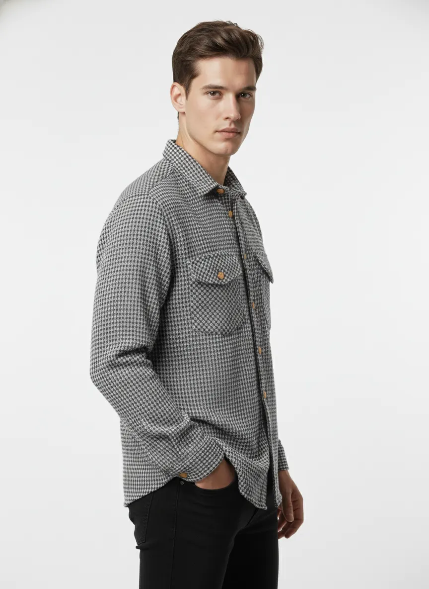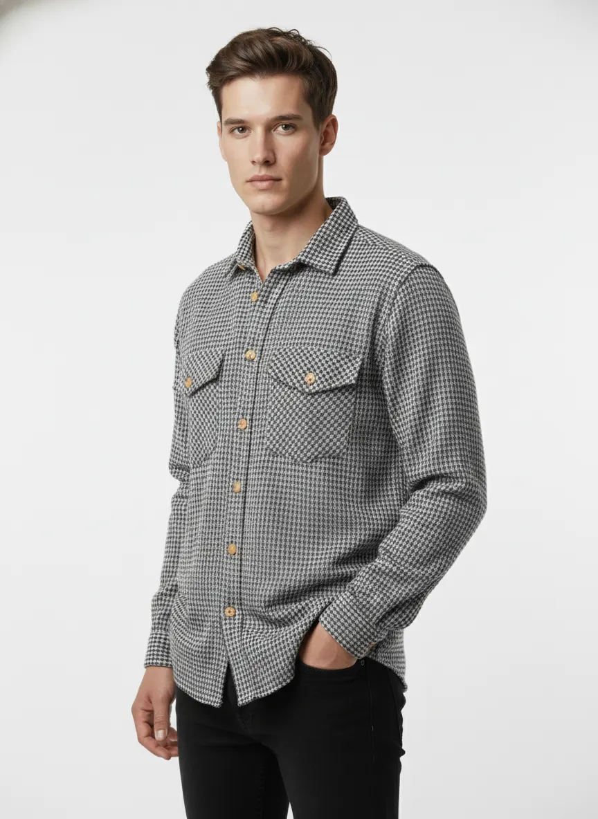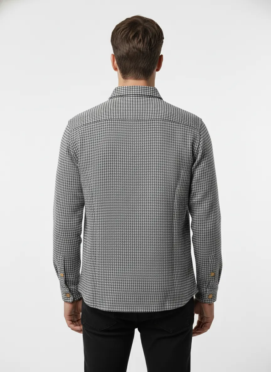 Refine your everyday wardrobe with this premium textured overshirt, designed for effortless layering and modern style. Featuring a subtle micro-check pattern in classic grey tones, this shirt strikes the perfect balance between casual and smart. The structured silhouette, wooden-style buttons, and dual flap chest pockets add a polished yet relaxed appeal.